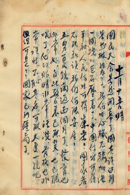 此為吳新榮1946年11月15日日記,國民政府於南京招開國民大會,隨著中國共產黨與國民政府的決裂,吳新榮感嘆中國離和平又更遙遠了。而第五個兒子吳夏統則健康的成長,相比之下,國家安定的路程遙遙無期。   國民大會,為孫中山提出概念,中華民國政府於1946年11月12日宣布,中國共產黨、中國民主同盟等政黨拒絕參加,等待三天後,1946年11月15日正式招開國民大會,通過中華民國憲法,又稱制憲國民大會。吳夏統,為吳欣榮與林英良之子,於1946年9月13日出生,夏統之名在出世前就已訂定,根據1946年9月4日日記中提到,吳夏統的命名意義:夏雄之弟(胞弟)、夏之次緒(秋生)、大漢一統(統一)、復統中華(光復),《晉書·夏統傳》中也有名為夏統之人,以孝順聞名,木人石心典故由此而來。