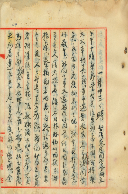 此係吳新榮寫於1947年1月23日日記。吳新榮本日上午前往嘉義參加「臺灣省東醫同學會」成立大會,會中由陳宗惠擔任主席,並通過章程提案,與會者尚有謝振聲、蔡欉等人;會後成員一同合影紀念與聚餐;下午受林宗焜、黃炳南等人招待。   日記中提及的「臺灣省東醫同學會」之「東醫」指吳新榮所畢業的日本東京醫學專門學校(現為日本東京醫科大學),而本日所通過的該會章程案,即為吳新榮於1947年1月17日所草擬的十二條章程。   日治時期,由於醫師職業收入較為豐厚,又相較自由,使得醫學校為當時學子熱門選擇。然而,臺灣當時僅有臺灣總督府醫學校(今國立臺灣大學醫學院)一間醫學校,由於競爭激烈,促使許多臺灣人轉向日本求學,如1923年至1937年間,專科以上留日學生有五分之二修習醫學,並多數就讀私立醫專,而吳新榮亦為此案例之一,又從「臺灣省東醫同學會」之成立,亦可反映當時代臺灣人赴日學醫之眾,以及醫界人際網絡。