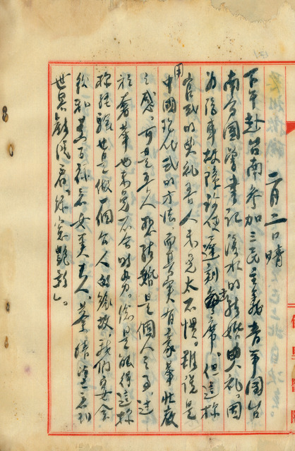 此係吳新榮寫於1947年2月2日日記。吳新榮本日下午前往臺南出席三民主義青年團臺南分團書記曾溪水婚禮,並因汽車故障而遲到;禮畢,與黃百祿等人至世界戲院看電影。