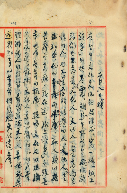 此係吳新榮寫於1947年2月8日日記。吳新榮本日應臺中文化交流社請託,撰稿〈紙上談兵〉一文,文中闡述對「文化人」的想法。   吳新榮同時具有醫師、文學家與政治家等多重身分,其中又以文學家身分最為人所知。日治時期,其曾參與組織「佳里青風會」及「臺灣文藝聯盟佳里支部」,亦為「鹽分地帶」文學集團代表人物與「北門七子」之一,戰後曾任臺南縣文獻委員會編纂組組長及主編《南瀛文獻》,並留下諸多著作,如膾炙人口的〈亡妻記〉、《震瀛詩集》等,而於其日記中,常見其提及投稿寫作、創作靈感、文學評論,以及參與藝文活動等,可從中窺見其寫作歷程與對人文的想法。