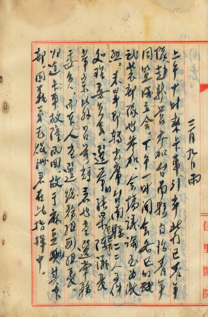 此係吳新榮寫於1947年3月9日日記。吳新榮本日上午出席臺南縣自治青年同盟成立會;下午出席臺南縣二二八事件處理委員會,並當選總務組副組長;之後於麻豆遇見元配毛雪之弟毛焜洲。   日記中提及的「二二八事件處理委員會」,原為因應1947年2月底臺北查緝私菸案‎,由臺灣國民大會代表、國民參政員、省市參議員等於該年3月1日組織的「緝煙血案調查委員會」,於3月2日擴大組織為「二二八事件處理委員會」,並於3月4日通知全省各縣市參議會於各地組織分會,可謂當時臺灣本土菁英在二二八事件發生後,主要與官方溝通以及內部協調的機制,而本日成立的「臺南縣二二八事件處理委員會」,即於3月8日在臺南縣參議會主持召集的臺南縣民大會中通過成立。   此外,「臺南縣自治青年同盟」為「臺灣省自治青年同盟」臺南縣分會,該團體由蔣渭川(蔣渭水胞弟)成立於1947年3月5日,以追求自治、民主選舉為、打倒臺省舞弊官僚等為訴求,並藉由號召臺籍日本兵參與,以安撫和分散其可能引聚的破壞勢力活動,同時蔣氏亦是二二八事件中,代表民間與時任臺灣省行政長官陳儀密切交涉的關鍵人物之一。   上述兩組織團體皆於二二八事件中扮演重要角色,而從吳新榮日記中則可窺見其於臺南地區的發展脈絡。