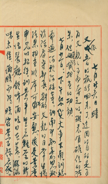 此係吳新榮寫於1947年7月26日補記7月21日日記。吳新榮本日下午搭乘火車前往臺南,途中巧遇已故元配毛雪之兄嫂廖願與胞妹毛碧梅;至臺南後,與吳嘉思一同拜訪陳看守,商討父親吳萱草於獄中的日常生活;受黃庚申招待於新生活餐廳;晚間夜宿黃百祿住家。   吳萱草此時正因涉入陳梧桐案,遭判刑入獄至今,而吳新榮為解救其父,從1947年7月21日至25日間再次展開旅行。   此外,日記中提及的吳嘉思與吳萱草為堂兄弟,而吳新榮於日記中常稱其「嘉思叔」,並從日記中可得知兩人互動密切,如1947年4月間,吳嘉思為吳新榮諮詢自新與否的重要對象之一。又據《吳新榮回憶錄》一書記述,吳新榮聽聞吳嘉思是其涉入二二八事件時,最幫忙的一位親族。   再者,於吳萱草事件中,吳嘉思亦為吳新榮重要的商議與協助對象之一,如1947年7月7日,吳新榮即囑託吳嘉思代送藥品給於獄中的吳萱草。