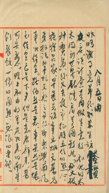 此係吳新榮寫於1947年8月5日日記。吳新榮昨晚與長女吳朱里一同拜訪蔡賢;前往世界戲院看電影;至夜市吃點心。本日上午,吳新榮拜訪辛文炳等人,請託協助「父親之事」;乘興南汽車回佳里;晚上與長子吳南星等人一同晚餐。   日記中提及的「父親之事」,指解救正因涉入陳梧桐案,遭判刑入獄至今的吳萱草。   此外,辛文炳(1912-1999)為臺南市人,臺南名紳辛西淮長子,畢業於日本明治大學法科,1938年與臺南望族翁木長女翁梅結婚。戰後繼承家業經營興南客運公司(惜臺灣輕鐵株式會社),並曾任臺南市長、南臺工商專科學校(今南臺科技大學)首任校長等職。又,吳新榮已故元配毛雪二哥毛昭癸之妻辛永秋,為辛文炳之二姐,可從中窺見臺南地區仕紳階級的姻親網絡。