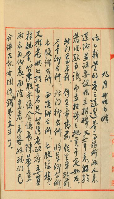 此係吳新榮寫於1947年9月24日日記。昨日,吳三連選舉事務所代表帶來數百張由時任臺灣省政府委員林獻堂與臺南縣參議會議長陳華宗署名的推薦狀,而吳新榮等人亦將此分發予訪客、病患,以及各團體,如醫師公會等。此外,吳新榮父親吳萱草預定將魚塭事業委託親友經營。   日記中提及的吳三連,與吳新榮同出生於北門地區,畢業於日本東京商科大學(今一橋大學),曾於日治時期擔任《臺灣新民報》東京支局長,此時正投入國民大會臺南縣代表選舉,並於日後高票當選。之後,歷任臺北市長、臺灣省議員等要職,而個人事業版圖跨足紡織、水泥、傳媒、文教等多項領域,亦因此被資深媒體人吳豐山稱為「國之大老」。   據《吳三連回憶錄》一書記述,吳三連於1947年請教本日提及的林獻堂之意見後,決定投入第一屆國民大會代表選舉。此外,雖然其於1940至1946年間長期滯留中國,對臺灣人地生疏,但因為憑藉陳華宗、龔聯禎等友人的協助,順利當選。   再者,從吳新榮日記中可知,其相當尊敬吳三連,又於1947年9月至11月日記中,常見其為吳三連助選國民大會代表之事,如本日所提,可從中窺見兩人友好關係。又,據《吳新榮回憶錄》一書記述,吳新榮當時擁護吳三連參與國民大會代表選舉,有幾項因素,例如相較其他候選人,其為有節操與理想的文化人、對臺灣有所貢獻、為同宗族人,以及人格特質良好等,亦因此欣然擔任其北門選區負責人。