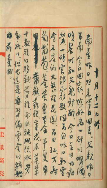 此係吳新榮寫於1947年10月12日日記。昨日,吳新榮長子吳南星返家;與吳雪金等人一同整理花園;父親吳萱草今日返家,並與其對酌。   日記中提及的吳雪金,為吳萱草次女與吳新榮二妹,畢業於臺南長榮女學校,曾就讀日本女子美術學校家政科,但因吳新榮元配毛雪逝世,未完成學業即返臺協助家務,返臺後曾任教職於佳里初中(今佳里國中)。1946年7月與林永睦訂婚,並於1947年11月30日結婚。   此外,吳新榮曾於1946年6月19日日記中提及,早先同意讓胞妹與林永睦交往,是因為林氏符合其提倡的三大條件:第一是門風,林氏為麻豆望族,亦是日治時期投身臺灣文化啟蒙與抗日活動的林銳之子;第二是學歷,林氏為吳新榮日本東京醫學專門學校(簡稱東京醫專)學弟,亦是吳新榮籌組的「東醫南瀛會」幹事;第三是體格,林氏樣貌魁偉,亦是游泳健將等。