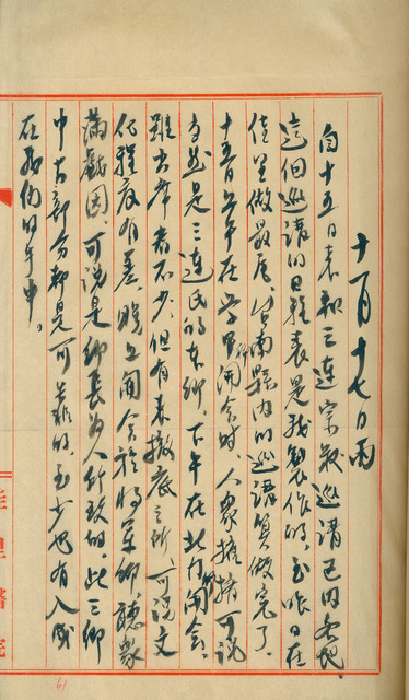 此係吳新榮寫於1947年11月17日日記。吳新榮幫吳三連排定11月15日至16日於臺南縣北門區內的巡迴演講活動,並全程陪同;本日有鑑於選舉時間迫近,仍馬不停蹄,準備請託各鄉鎮協力者,做最後努力。   日記中提及的吳三連,與吳新榮同出生於北門地區,此時正投入第一屆國民大會臺南縣代表選舉,而此次選舉投票日為11月21日至23日。據《吳三連回憶錄》一書記述,吳三連於1947年請教時任臺灣省政府委員林獻堂之意見後,決定投入國民大會代表選舉,並獲得林氏與時任臺南縣參議會議長陳華宗的聯名推薦。雖然其於1940至1946年間長期滯留中國,對臺灣人地生疏,但憑藉陳華宗與龔聯禎等友人之協助,順利當選。   從吳新榮日記中可知,其相當尊敬吳三連,又於1947年9月至11月日記中,常見其為吳三連助選國民大會代表之事,如本日所提,可從中窺見兩人友好關係,以及吳新榮於選舉中的協力角色。   此外,據《吳新榮回憶錄》一書記述,吳三連此次選舉雖自身經費匱乏,但獲得不少北門區支持者奧援,不過卻仍有兩項不利條件,其一是吳三連不參與政黨,缺少黨的支持;其二是吳三連為基督徒,遭人質疑會對本土寺廟不利。然而,據吳三連家屬表示,在吳三連出生前,雖其父母與兄長皆已受洗為基督徒,但吳三連個人未曾受洗。