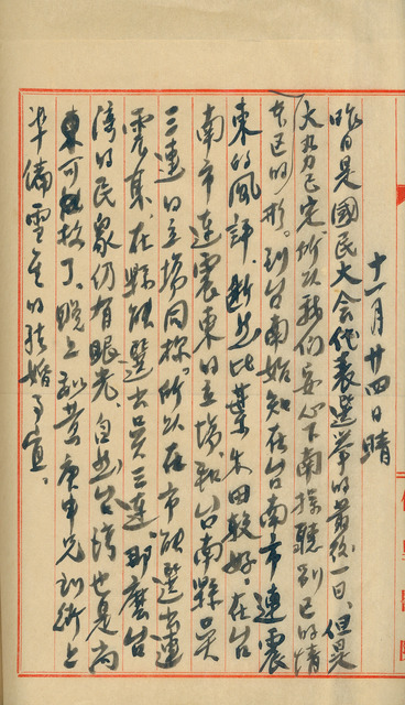 此係吳新榮寫於1947年11月24日日記。昨日為第一屆國民大會代表選舉最後一日,吳新榮聽聞臺南市選況以連震東風評較佳;籌備胞妹吳雪金婚禮事宜;本日確定吳三連當選臺南縣代表;參與臺南縣醫師公會會員大會;成立臺灣醫學會臺南縣分會。   據《吳三連回憶錄》一書記述,吳三連於1947年請教時任臺灣省政府委員林獻堂之意見後,決定投入國民大會代表選舉,並獲得林氏與時任臺南縣參議會議長陳華宗的聯名推薦。雖然其於1940至1946年間長期滯留中國,對臺灣人地生疏,但憑藉陳華宗與龔聯禎等友人之協助,順利當選。   從吳新榮日記中可知,其相當尊敬吳三連,又於1947年9月至11月日記中,常見其為吳三連助選國民大會代表之事,可從中窺見兩人友好關係、吳新榮於選舉中的協力角色,以及當時的選舉方式,如請鄉鎮長協力動員、運用名片與推薦狀宣傳、舉辦各地演講活動等。   此外,日記中提及的「臺灣醫學會」,成立於1902年8月,原為在臺日人醫師、藥劑師為增進醫學學術交流而組成的民間學術團體,同年亦創刊至今仍為臺灣最高醫學權威雜誌的《臺灣醫學會雜誌》(簡稱《臺灣醫誌》)。1990年由「臺灣省醫學會」改名為「中華民國臺灣醫學會」,2000年再次更名為「臺灣醫學會」至今。本日提及的杜聰明,從戰後1946年起至1971年皆為該會會長。