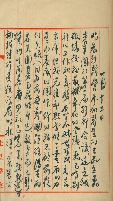 此係吳新榮寫於1948年1月12日之日記。前一日吳新榮到新營參加三民主義青年團的第一屆幹部會議,但抵達時會議已經結束後被帶到招待所吃過飯後參與工作報告與討論會,結束後搭車回到麻豆;晚上則與邱炳鴻等人一同到酒家飲酒聚會。   日記中提到的三民主義青年團,簡稱三青團,最初於1938年7月9日於武昌成立,是中國國民黨內重要的青年組織。1945年9月,張士德來台發展三青團,並募集許多台灣各地菁英參與,吳新榮亦被招攬協助成立三青團曾北區團。其主要工作是保護公產、維持社會治安等,但在二二八事件後其地方領導階層多被捲入其中,因此沒多久便被解散。吳新榮自1945年9月下旬收到成立三青團相關消息之後,便常為此事四處奔波、拉攏成員,其1945年9月以來的日記內容多與三青團相關。他在回憶錄中曾自述自己為何熱衷於三青團之事,他提到因在日本宣布投降後,台灣暫時陷入無政府狀態,當時許多人趁亂攻擊日本人,導致社會秩序不穩定,在加上謠言四起,許多台灣的知識份子便主動籌組相關組織協助穩定治安,因此吳新榮認為自己應作為一個先驅者為社會服務,因此十分熱衷的參與三青團的籌組活動。