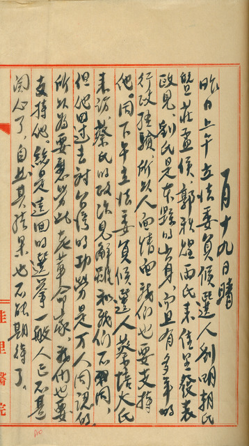 此係吳新榮寫於1948年1月19日之日記。立委候選人劉明朝、莊孟侯等人到佳里發表政見;下午則有另一位候選人蔡培火到訪。   關於吳新榮提到的立委選舉,應是中華民國於1948年1月21日至23日舉辦之第一屆立法委員選舉。此次選舉為因應中華民國於1947年12月25日開始行憲,因此於隔(1948)年展開第一屆立法委員選舉,1949年時中華民國政府於國共內戰中失利,敗退台灣,但第一屆的立法委員僅約380多人隨著政府撤退來台。   另關於蔡培火,其曾獲得林獻堂資助到東京留學,期間擔任啟發會、新民會幹事,之後參與台灣文化協會,可謂台灣民族運動先驅,亦曾致力於推廣台語羅馬字化。戰後先後擔任立法委員、台灣省紅十字會長等職務。   吳新榮在日記中提到自己對於幾位立委候選人的態度,劉明朝是同鄉,且有多年行政經驗,於人情方面自然要支持;蔡培火的政治見解雖然和他不同,但他過去的功勞確實受到萬人認同,因此也必須支持這位老革命家。