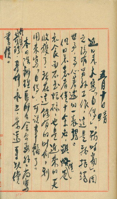 此係吳新榮寫於1948年5月10日之日記。近日吳新榮專心寫《自傳》;另辦理醫師公會的公文,並寫信給黃奇珍等人。   日記中提到吳新榮提筆撰寫之《自傳》,應指《震瀛自傳》,該書自1948年2月開始提筆撰寫,至同年7月時完成,一共6冊,但未公開發表,其手稿現藏於國立台灣文學館中。之後於1951年底,吳新榮根據該書改寫成《此時此地》一書,1977年時改名成《震瀛回憶錄》出版。值得注意的是,《震瀛回憶錄》中吳新榮以「夢鶴」代稱自己,其他人名亦多採用化名。《震瀛回憶錄》紀錄吳新榮前半段人生歷程與自身感懷,撰寫其出國留學、回台執業、從事文學運動、重歸祖國、經歷二二八事件……一連串大事的經歷與心境轉折,除日記外是了解吳新榮生命歷程與思想的重要資料。
