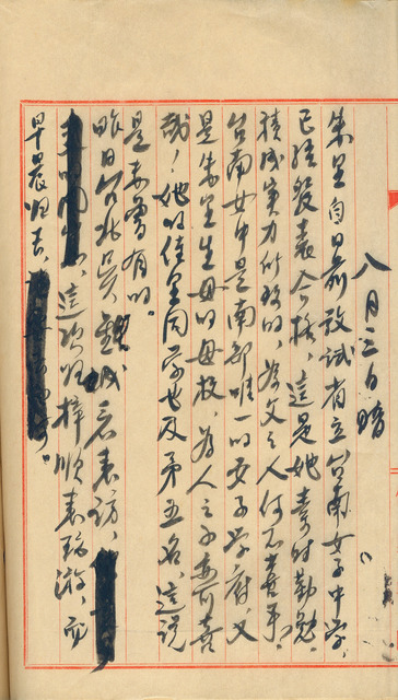 此係吳新榮寫於1948年8月3日之日記。女兒吳朱里考取省立台南女子中學合格,吳新榮感到十分開心。另前一日有吳金成來訪。   吳新榮在日記中提到台南女中,不僅是當時台南唯一的女子學府又是吳朱里生母毛雪的母校之事,當年毛雪就讀的是台南州立台南第二高等女學校,當時尚有另外一間台南州立台南第一高等女學校,1947年時兩校合併改稱省立台南女子高級中學,2000年時更名為國立台南女中。   為人父母的吳新榮十分關心子女的教育問題,對於子女參與升學考試之事十分關心,也會對子女考上理想學校而開心,如本篇日記提到女兒吳朱里考上省立台南女子中學,他認為「這是她素時勤勉,積成實力所致的,為父之人何不喜乎?」欣喜之情可見一般。