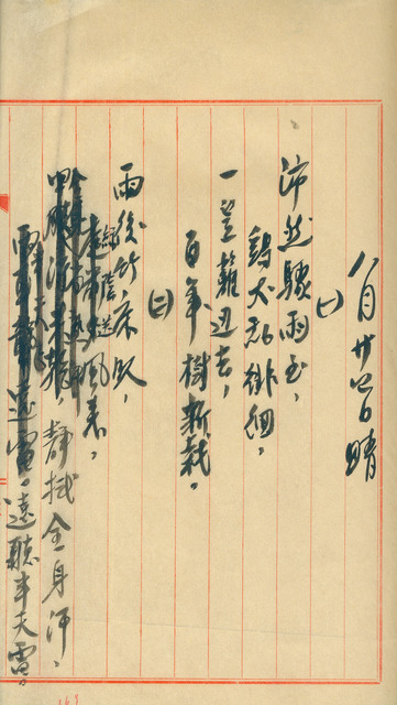 此係吳新榮寫於1949年8月24日之日記。吳新榮本日以四首詩作為日記,書寫近日的生活及心境。   吳新榮時常於日記中書寫詩句以遣懷或寫景。在日治時期時,便有書寫漢詩的紀錄,同時也會因當時的時空背景與環境而寫俳句;在光復後,則多以漢詩為主。如本日日記中的四首詩,前兩首皆為描寫居家日常,田園風情;而第三首則是吳新榮透過報紙看到當時戰爭不斷,時局混亂的狀況,雖然已發誓要暫時避居,不問世事,但在心中,卻還是沒有全然放下。第四首詩則描寫了家庭的飲食,由此可知吳新榮當時的經濟狀況。