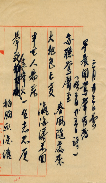 此為吳新榮寫於1951年3月23日的日記。吳新榮改2月25日日記的詩句,寫成一首漢詩〈早晨聞鶯聲有感〉,在詩中抒發自己的心志。   日治初期歷任總督為收覽懷柔台灣文人,獎勵風雅、禮遇賢士,台灣的詩人聯吟會因而盛極一時,詩社如雨後春筍般出現。吳新榮出生於1907年,一出生即為日治時期,其父吳萱草為台灣南部頗負盛名的詩人,善於寫作漢詩並組織「白鷗吟社」提倡漢詩寫作。在這樣的背景下,吳新榮接觸文學的時間點很早,並且在早年就有漢文寫作的能力。有許多日治時期出生的台灣文人,因母語為日語或台語,對漢語較不熟悉,因此在國民政府遷台後遇到了語言轉換的困境,而吳新榮卻非如此,從他的日記即可看出,他能夠流暢使用漢文與日文兩種語言寫作,也因此在戰後能無縫接軌投入文學創作。今日,吳新榮的文學成就多以「鹽份地帶詩人」受到重視,他曾組「青風會」試圖要提振當地知識青年的思想及政治力量,最後不到兩個月即解散,但解散後的青風會便以吳新榮、郭水潭、徐清吉…等文學青年為主,共同鼓吹鄉土文學並形成「鹽分地帶文學」風格,成為南台灣重要的文學重鎮。吳新榮的創作相當多元,除了鹽分地帶時期的日文詩作之外,其漢詩、新詩、台語詩的創作,與日記、散文、日常隨筆的寫作,都是吳新榮耕耘的文學版圖中不可忽視的部分。