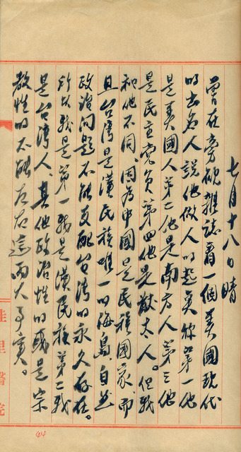 此為吳新榮寫於1951年7月18日的日記。吳新榮從閱讀雜誌上看到的美國政治人物,連結到自己的生命經驗,認同自己漢民族、台灣人的身分,並將之當成自己的政治資本。談到競選省議員的想法,他決定要參選,但若有合適的北門才俊出來競選,吳新榮也會退出並支持他,但他要自己出錢。 文中提到的省議員選舉,為1951年11月18日舉行的「第一屆臨時省議會議員選舉」,以各縣市議員為選舉人,採間接選舉的方式選出,也就是說一般民眾並無臨時省議員的投票資格,僅縣市議員能代為展現民意。國民政府來台後,於1946年成立了「臺灣省參議會」,以各縣市參議員間接選舉的方式,選出省參議會議員,任期2年。第一屆省參議員期滿後,原應於1948年改選,但因當時時局混亂延長任期,而後台灣的行政區劃又經過大幅度的改動,各縣市相繼成立新的縣市議會,當時選出的省參議員已不具代表性,故於1950年12月結束了「臺灣省參議會」,隨後成立「臺灣省臨時省議會」。臺灣省臨時省議會的第一屆議員為間接選舉,任期2年,第二屆開始改為直接選舉,任期延長到3年。1959年,臺灣省臨時省議會結束,改稱為「臺灣省議會」,第三屆臨時省議員也改稱為第一屆省議員。目前,省議會民意機關的功能已走入歷史,由立法院、立法委員取代。