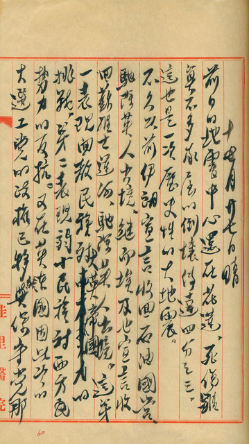 此為吳新榮寫於1951年10月27日的日記。前日(10月22日)台灣發生大地震,震央於花蓮。吳新榮提出了對近期國際大事的看法;另一方面,對臨時省議員選舉,他也列出了支持郭秋煌的理由與原則。家中近來有多組訪客,南圖、南河兩個孩子今日也從台南回家,吳新榮煮自家養的雞給家人吃,闔家歡樂,可惜南星腹痛沒有進補到。 伊朗於1950年始推動石油國有化,1951年當時的首相穆沙迪克(Mohammad Mossadeq),以強硬的態度成功逼退了英伊石油公司,但此舉不僅導致英伊關係的惡化,也成了1953年伊朗政變、穆沙迪克被推翻的原因之一。同年,埃及要求英國退出在蘇伊士運河的駐軍,並想將運河的經營權收回國有化,英國則未立即同意,直到1954年兩國才達成撤軍協議。蘇伊士運河的地理位置特殊,牽扯到龐大的利益,因此埃及收回運河、國有化蘇伊士運河公司的過程並不順利,1956年還爆發了蘇伊士運河危機,在聯合國的介入下才解決。與日記中提及的國際大事相關的後續發展有:阿拉伯民族主義興起對抗西方強權;大英帝國國勢漸頹,世界強國的地位被美國取代;戰時邱吉爾帶領的保守黨,主導了1950年代的英國政壇,對照日記中吳新榮的解讀,可以看出他對國際政治關心深入,也十分敏銳。