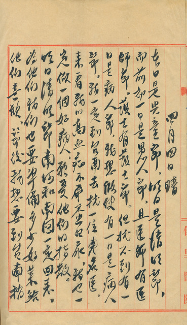 此係吳新榮寫於1952年4月4日之日記。本日為兒童節,吳新榮由此聯想各種相關的節日,並表達希望名醫為自己診治高血壓的願望;明日清明節,吳新榮預計吳南河和吳南圖將歸,故準備菜餚以待;並打算在節後請蘇丁壽診察,吳新榮自認近期可專心寫稿,疲倦時養雞以靜養,為《震瀛隨想集》與來年做準備。   蘇丁受,台南著名醫學界人物。畢業於臺灣總督府醫學專門學校,後執業成為醫師。曾擔任日治時代臺南市第一屆民選議員,同時也是臺南市醫師公會的發起人之一。由日記中自1939到1958年間的多筆日記中的紀錄中可以發現,吳新榮在妻子、叔叔、母親生病,甚至是自己罹患高血壓時,都交由蘇丁壽為其診治;本日及之後的多數與心臟、血壓相關的病症,多數請蘇丁壽治療便是兩人關係密切之佐證。蘇丁受診所於2009年通過的南鐵東移工程中,因不具法定文化資產身分且屬私有財產而遭到拆除的命運。