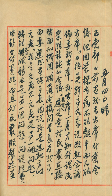 此係吳新榮寫於1952年5月4日之日記。吳新榮日前曾受區黨部相召出席會議,但已林榮樑生病而婉拒,日後又表示會議改期,吳新榮出席後才知是民眾服務站相關的會議,因其要網羅地方元老吳新榮為理事長而改期。吳新榮對自己的身分及能力雖有疑慮,但也順從眾議。吳新榮認為在北門中學與清風莊升格後,對地方文化科學已滿足,在《此時此地》的寫作上也有進步,只有家庭經濟與妻子之病為心中阻礙,今日林榮樑病情好轉,使吳新榮得以安心。   國民黨來台之後,有鑑於在中國大陸執政時,因喪失基層民心與缺乏滲透民間輿論的管道而失敗的經驗,除掌控中央行政體系外,也需要重新建立社會影響力,方能以外來政黨之姿,面對台灣的廣大群眾。同時,因二二八事件影響,本省人對於區黨部及普遍存在的外省基層幹部觀感不佳,勢必得將國民黨的面貌重新包裝,以便於黨幹部活動,並使民眾對其有感,故國民黨廣泛成立民眾服務站,一方面從事社會事業,提供與民眾息息相關的代書、法令諮詢等活動,快速建立民眾網路與偏鄉服務;另一方面,與區黨部一體兩面的特性也使其成為監察人民,穩固地方,乃至於宣傳黨國、政治動員的工具。吳新榮在地方上素有聲望,為當地人民所信賴,加上其文、醫、政交雜的背景,使吳新榮即使對於此事並無太大興趣與意願,仍被推舉的原因。