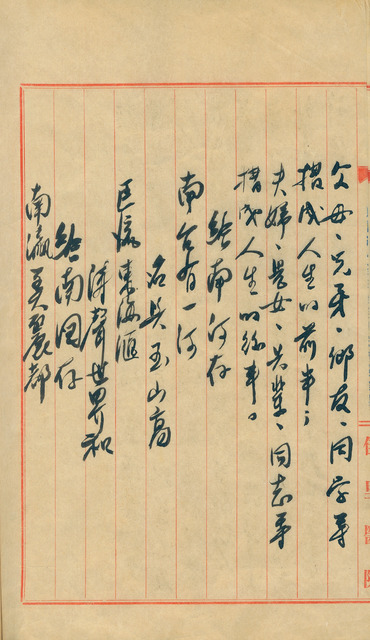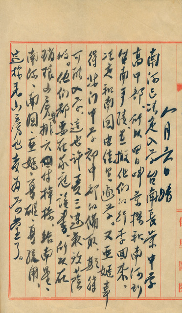 此係吳新榮寫於1952年8月6日之日記。吳南河4日與林榮樑辨理長榮中學高中部入學手續,並將行李搬回,與吳南圖由通勤就學,吳亞姬為北門中學初中部備取。吳新榮為子女在琑琅山房準備六付桌椅供其讀書。今日八個孩子前往北門拜訪阿姨,吳新榮順道前往西山為舅父看病,下午攜吳夏統、吳夏平返回。孩子們自北門回來後表示要前往六甲祭拜外祖父忌辰,吳新榮雖不反對,但擔心交通安全及旅費。因子女年歲漸長,各備相簿,吳新榮在日記中記錄寫在子女相簿上的文字。   吳新榮對兒女的教育情況十分關注,除布置讀書的環境外,亦努力使其子女向上而多次訓誡;在日記中提及的「生活的重要部分」,「一生最大的使命和工作」,皆可證明其對於子女教育的注重,是以在日記中,多見對子女學業的規劃與盤算。本日日記中吳南河就讀長榮中學,吳亞姬考取北門中學初中部備取,在同年7月29日日記中,皆有提及;其中吳南河長榮中學與省立臺南二中皆有機會就讀,而在其中選擇了好友戴明福擔任校長的長榮中學;而吳亞姬在省立一女初中部落榜後,準備在長榮女中與北門中學初中部中選擇。吳新榮將對子女未來的規劃詳細的寫在日記中,對子女之愛護與期盼,可見一斑。