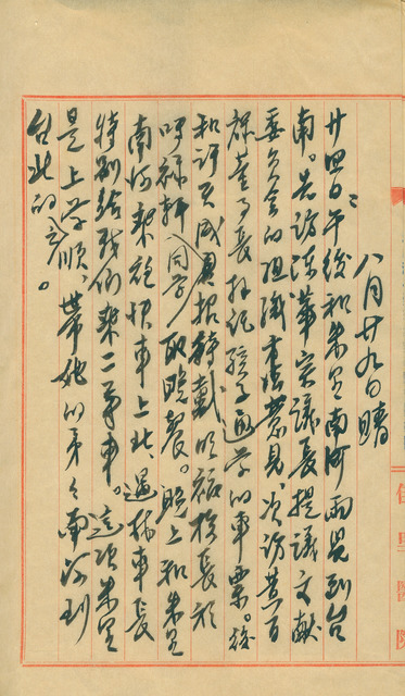此係吳新榮寫於1952年8月29日書寫之日記,本日記錄8月24日至8月28日之事。24日吳新榮與吳朱里、吳南河前往臺南,先向臺南縣議長陳華宗提議文獻委員會的組織意見,又因其子通學車票一事拜託黃百祿,後與同學許天成於味祿軒招待長榮中學校長戴明福,晚上與二子乘夜車北上。25日早上到台北,吳新榮先向呂榮輝拜託陳仙降之事,後與郭水潭討論文獻委員會的問題。正午前往中山堂受由黃鎮球主持的聯勤司令部招待,午餐後開省醫師公會理監事會,主要為醫師衛勤受訓,後會同衛生署衛生處及有關團體討論。晚上於新蓬萊招待官、軍方人員。26日與陳仙降宿於大同旅社,今早拜訪黃奇珍、李君晰、吳敏誠等人,並共午餐,故不能至錦江會館受衛生處招待。餐後先後拜訪毛碧霞與吳壽坤,得知吳壽坤一家平安,張實、吳朱里、吳南河祖孫三人去動物園。與吳敏誠、陳仙降到大世界戲院觀影《卡爾蘇》後投宿北投百樂園,並作五言詩於日記上。27日吳新榮回台北拜訪黃奇珍,並與之一同拜訪王金長。午餐後乘車回家,因疲累請曾瓊玉明日再來。28日上午吳新榮讓曾瓊玉閱讀〈亡妻記〉,晚上以家長會長的名義於雅賓招待升學班老師。在日記最後附上現代詩〈夜車中〉。   吳新榮由於身兼數職,事務繁忙,或是受外在環境左右,時有無法當其書寫日記之情形,是以吳新榮會選擇某一日日記,記載先前一日或數日的簡略事務,而非本日經歷。如本日日記雖是於8月29日所書寫,然日記中的內容,卻是同月24日至28日的概況。   吳新榮除參加臺南縣醫師公會、台南縣醫師公會北門分會外,亦多次參加台灣省醫師公會。在1950年5月15日日記中便有提及吳新榮於5月14日以台南縣代表參加臺灣省醫師公會代表大會,並在會議上被選為理事,而1951年4月30日日記中所記載的第四屆省醫師公會代表大會上,吳新榮在行政區域劃分後的理監事改選中獲選監事。除這兩次獲職的會議外,吳新榮亦在日記中紀錄了多次參與省醫師公會會議的議題與結論,可見吳新榮對此的重視。   吳新榮之父吳萱草為當地著名的詩人,曾在台南地區組織白鷗吟社、南瀛詩社等詩歌創作組織,創作、發表詩歌無數,有吳新榮為父親所編的《忘憂洞天詩集》傳世。吳新榮在父親的言傳身教,耳濡目染之下,也曾在各類報章雜誌上刊登中文詩歌;在日治時代結束後,吳新榮也沒有停下中文詩歌的創作,無論是較為傳統的五言詩,亦或是現代化的新詩,皆有涉略。本篇日記中,分別於北投百樂園所作之五言詩與在乘車返家途中所作之現代詩,便是佐證。