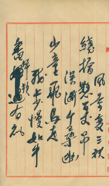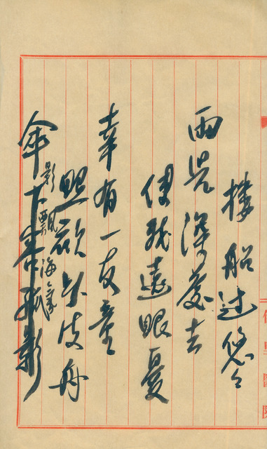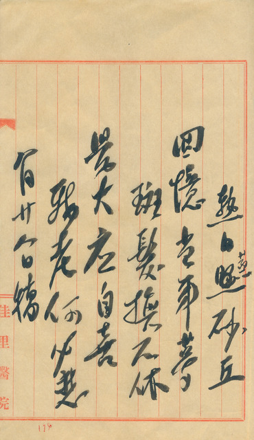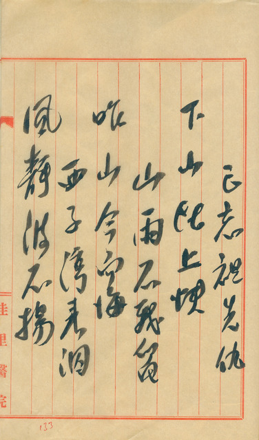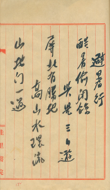 此係吳新榮寫於1953年8月28日日記,這一天寫有古典詩〈避暑行〉。   從於吳新榮日記中,經常可見他創作的詩文,如1947年二二八事件發生時,他受累逃亡,期間居住在友人黃騰家中,因讀了中國五卅慘案發生後發行的《洪水集》,有感而發,寫了名為〈讀《洪水》後〉的詩作,以「洪水」比喻當時台灣社會遭逢的劇變。1947年5月,再次被捕,入獄期間,作〈獄中吟〉,是憤懣、鬱悶等心緒的記錄。   這天所寫的〈避暑行〉,獨立收於日記本之中,從詩作內容來看,推測吳新榮可能是攜子女至屏東、高雄一帶旅遊。內容提到山地門、西子灣等地名,途中遇山童在山中行中飛步自如,蕃婦應對有禮,亦對高山、深淵、丈尺等地景地物有所描寫。詩中還有不少對比感懷,除上述山童、蕃婦與敘述者「我」的對比,也有「兒大」與「我老」的感懷。本篇日記是吳新榮1953年最後一則日記,依據《吳新榮日記全集》第9冊的編按,吳新榮自1952年11月起,因擔任臺南縣文獻委員會委員兼編纂組組長後,因專心投入工作,書寫日記的次數不如以往,爾後常見有數天日記合併於一天回述、補寫的情況。