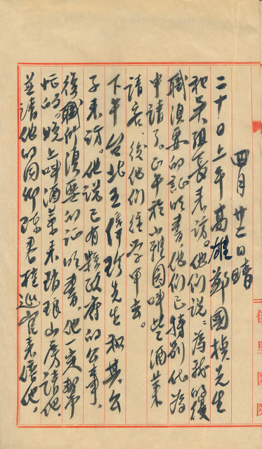 此為吳新榮記載於1955年4月22日日記,得知親戚過世的吳新榮感慨萬分,請託父親前往幫忙喪事之進行,自己前往台南文獻委員會。   文獻委員會復職命令一事,吳新榮自1955年2月14日出獄以來,屢次在日記中提到文獻會復職之相關事宜與心中之考量,2月16日日記提到:「只待政府下付證書,就可能手續復文獻委員會之職」說明自己復職於文獻會的可能;3月3日又提到文獻會同仁們除了為自己的歸來感到歡喜外,亦多方打聽與研究復職一事;3月9則提到對復職文獻會的考量與糾葛,其寫道:「不應該犧牲我此生的一時期」,對自己是否復職表現出糾結之感,但其又考量文獻事業的歷史意義重大,且先前已奠定了文獻工作的基調與脈絡,擔心未有適當的接任者、原先的進度易手恐不盡人意,最終仍決定著手準備復職之程序;遞交相關資料後,便開始等待著復職的最終結果,期間,亦寫信給臺灣省議會議員的同宗長輩吳三連,暗請其幫忙,終在4月11日收到復職命令,吳新榮雖恢復委員會一職,但仍須等待保密局的相關證明,此間有許多人都表示願意提供協助。