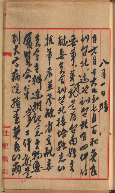 此為吳新榮記載於1955年8月1日日記,吳新榮與林榮樑自六月二十六日前往台北,第一為了台南縣文獻委員會工作,在許多人的協助下完成,第二為了採買妻子林榮樑的藥物,第三為女兒鑑定王金長兒子是否可以成為吳朱里的丈夫,之後拜訪親戚。台北的行程結束後,七月一日返回佳里,被警察通知如要遠行請至派出所申請。最後在七月二十四日中,吳欣榮等人一同在台南地區遊玩。   台南文獻委員會,在1952年吳新榮接下台南縣文獻委員會工作,曾任委員兼編纂組組長。隔年3月主編之《南瀛文獻》創刊。但在1954年10月受李鹿案牽連,被捕入獄,此事件為台南市工委案,李鹿因加入共產黨等組織遭到政府追查,1952年吳新榮曾與李鹿接觸過,所以在1954年被政府找上門,並且被捕入獄,扣押約四個月後出獄,在恢復職位後,馬上投入工作中,而今日記載之日記第一件首要任務就是為台南縣文獻委員會工作,可見吳新榮相當重視。