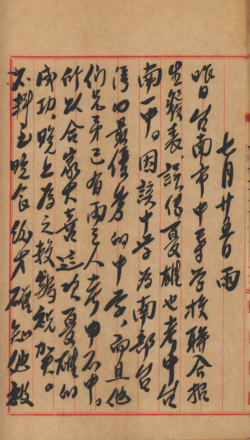 此係吳新榮寫於1956年7月25日之日記。前一日發表臺南市中等學校聯合招生成果,誤傳吳新榮之子吳夏雄考取臺南一中,因此晚上大舉慶祝,之後才得知此消息為誤傳,吳夏雄實際考上的學校是臺南二中及長榮中學,再三考量後決定先就讀臺南二中。另在高雄報考高雄女子師範學校的女兒吳亞姬通過初試,即將進行複試。   為人父母自然是望子成龍、望女成鳳,由於7月為升學考試旺季,吳新榮的子女中今年有吳亞姬及吳夏雄分別參加高中及國中的考試,因此近期的日記多與兩人的考試之事有關,從吳新榮的日記中可見其非常關心子女的學業,若是考試失利也會想辦法安撫子女的情緒。   關於吳夏雄的升學問題,據吳新榮日記所述,原先據推測吳夏雄的成績可能可以考取臺南一中,前一日發表結果時誤傳其考上臺南一中,結果卻是空歡喜一場。而吳新榮希望其子就讀臺南一中,除了吳夏雄兄長先前考取失利之外,便是因為臺南一中是當地最好的學校,且吳新榮認為臺南二中學風不佳,升學率亦不高;而私立學校如長榮中學則是由於學費較為昂貴,所以暫時不考慮。思慮再三後決定先讓吳夏雄就讀臺南二中,之後再轉回北門中學就讀,一是因為公立學校學費較為便宜,二則是因為靠近家裡較為方便。