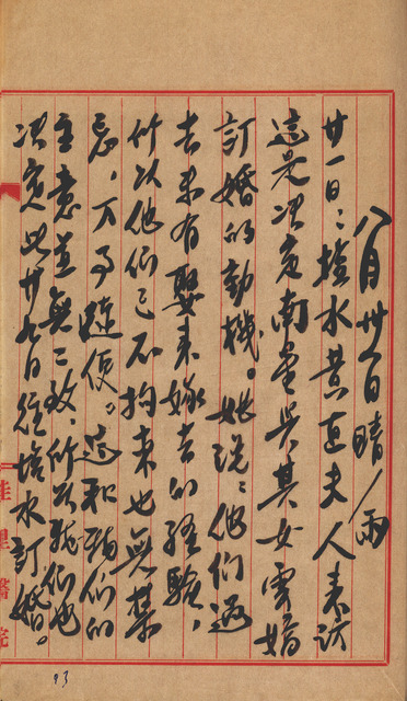 此係吳新榮寫於1956年8月31日補記8月21日之日記。黃直的夫人來訪,與吳新榮決定吳南星與黃雲嬌的婚事。   本篇日記提到的黃雲嬌為吳新榮之長媳,於1959年時與吳新榮長子吳南星結婚。傳統習俗中男女結婚多依賴父母之命、媒妁之言決定,且多會找介紹人或媒人居中介紹,如先前的日記中曾提及中吳南星在家人陪同之下,經翁鐘五的安排與黃雲嬌及其家人會面商談雙方的婚事。另於1956年8月1日的日記中提到他們召開家庭會議,其中論及吳南星的婚事,因吳南星並不反對,所以打算先訂下來後等他服完兵役再做打算,本篇日記則提到黃雲嬌母親來拜訪吳新榮,雙方敲定婚事,決定於29日訂婚。