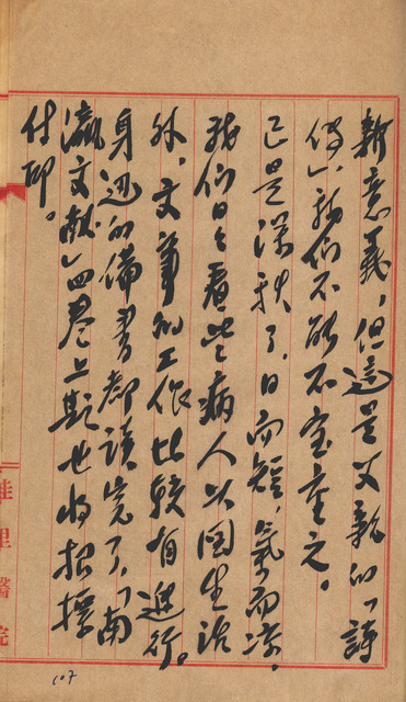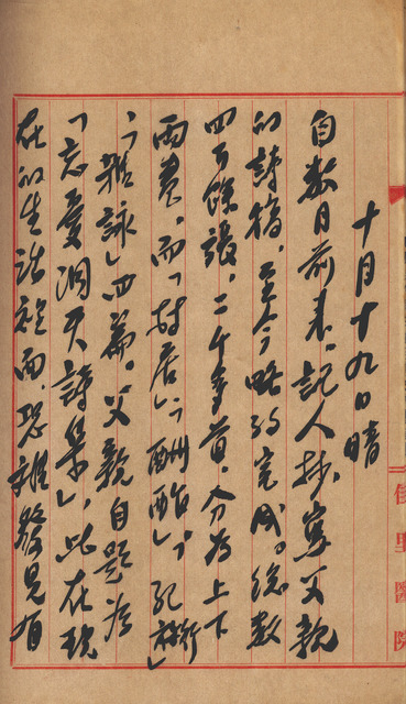 此係吳新榮寫於1956年10月19日之日記。吳新榮數月前託人抄寫父親吳萱草的詩稿,至今已經約略完成,將集合起來以《忘憂洞天詩集》出版。另日前與吳寅卯等人去海汕觀光。   吳新榮之父吳萱草,號牧童,晚號穆堂,又號雅園,吳新榮的「小雅園」便是取自其父之名號。1912年與諸位詩友組織「嶼江吟社」,為南台灣較早之詩社,1914年以詩社同仁多移居將軍庄為由,又改組為「盧溪吟社」,其後又改名為「白鷗吟社」(1921年)、「琅環詩社」(1947年),最後於1951年統合於台南縣新成立的全縣性詩社「南瀛詩社」中,吳萱草被選為副社長。其作品收錄於《忘憂洞天詩集》上下卷。   關於吳新榮替其父編纂詩集之事,據其日記所述,最早於1944年9月5日的日記中提到他打算將吳萱草在報上發表過的漢詩集結成冊出版,其後便著手進行蒐集文稿、編訂的作業,該詩集最後於1958年出版。