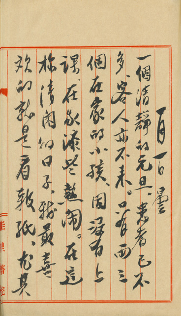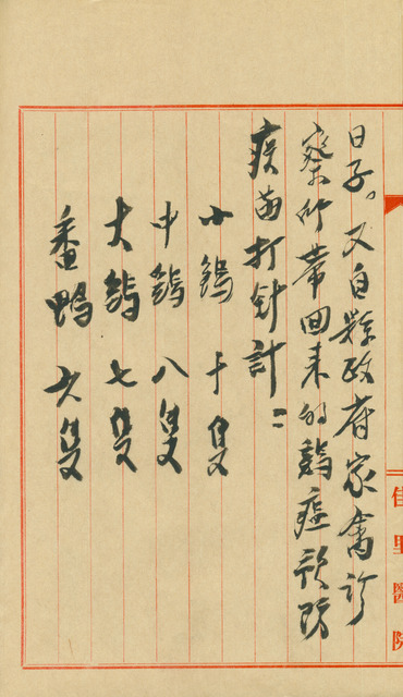 此係吳新榮寫於1958年1月1日日記,今日為元旦,患者少,能在家閱讀,孩子不用上課,為家中增添熱鬧。   今日時值一年之初,因來診的患者數少,而有時間閱讀,還可種花、養雞,加之收到不少友人的年賀。閱讀吳新榮日記可知他喜歡飼養動物、種花草,吳新榮在1933年9月4日開始重新寫日記,他認為日記可作為生命之記錄,生活之反省,自敘平時除行醫工作,每日也會閱讀報紙、書籍、養鳥、種花等活動更是生活樂趣之一。提到種植花草不稀奇,吳新榮1938年4月15日、4月19日的日記中,曾記述他曾飼養過鴿子、猴子、羊、雞、貓等動物。吳新榮將其住所命名為琑琅山房,在《琑琅山房》一書中〈九、粗餐英雄〉,也提及琑琅山房內的小雅園依四季栽植不同花卉、水果,在1958年年初的這篇日記裡,提到自從家禽診療所帶回雞瘟預防針,為家中飼養的大小雞隻施打疫苗。