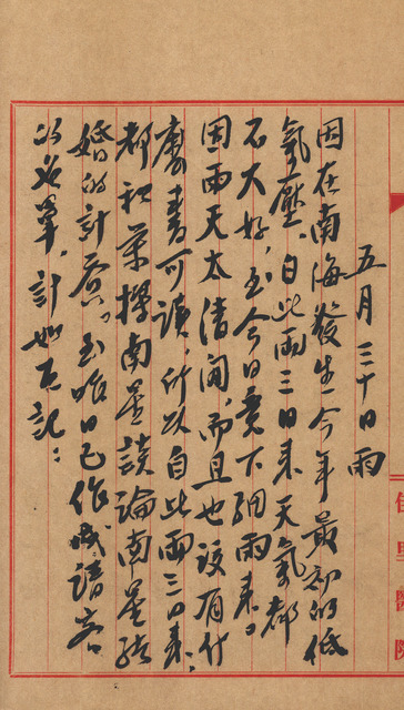 此係吳新榮寫於1958年5月30日日記,和家人討論兒子南星結婚事宜,與吳國順一起整理花園。   南星為吳新榮夫婦的第一個孩子,出生當時,家族親友們皆極為歡喜迎接這第一個孩子。從1933年11月13日日記中,即可從為南星取名一事,看見親族、友人對這孩子的期待,往後從吳新榮日記中亦常見吳新榮描述南星或笑或哭、開口出聲皆是生活中重要的事。如今,南星長大成人,即將面對人生大事,全家族一起討論南星的結婚計畫,在這一天的日記裡,記述了預定宴客數,以及婚禮當天的工作人員名單,名單中有許多親族,亦有多位是吳新榮長年友好往來的摯友。