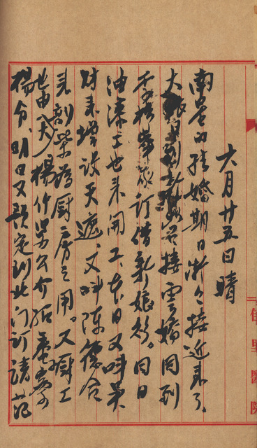 此係吳新榮寫於1958年6月25日日記,籌備兒子南星的婚事,從敬拜天公、重新粉刷屋舍到各項禮品的準備。   南星為吳新榮夫婦的第一個孩子,出生當時,家族親友們對南星這位新成員的加入都非常歡喜,從1933年11月13日日記中,即可從為南星取名一事,看見親族、友人對這孩子的期待。如今,南星長大成人,即將面對人生大事,全家族一起歡樂地討論南星的結婚計畫,在1958年5月30日日記中,吳新榮記述了婚禮當天的預定宴客數,以及婚禮當天的工作人員名單。在1958年6月1日的日記中,阿公吳萱草交待長孫的婚禮一定要雙親打理,不可託人包辦。隨著婚期逐漸接近,6月25日這一天,陸續準備新娘衫和子婿衫、粉刷油漆、喜餅、聘金等事宜,眾人益加忙碌。