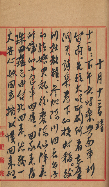此係吳新榮寫於1958年10月13日,補記10月11日日記。下午到大明印刷所看《忘憂洞天詩集》卷下的校對稿,之後,出席陳川田兒子婚禮。   日記中提到的《忘憂洞天詩集》是吳新榮之父吳萱草的詩集,吳新榮自1944年開始集結父親的詩作,有上卷和下卷,分兩次出版。1958年,為祝賀父親七十大壽,吳新榮積極編纂《忘憂洞天詩集》上卷,作為紀念,經多次校閱,送至台南大明印刷局付印。據吳新榮1958年8月16日日記所載,這本書是父親所著、由吳新榮編纂、孫女珠里繪畫,這三代共同完成的著作,可謂令人欣喜。此次再編纂下卷,別具意義。