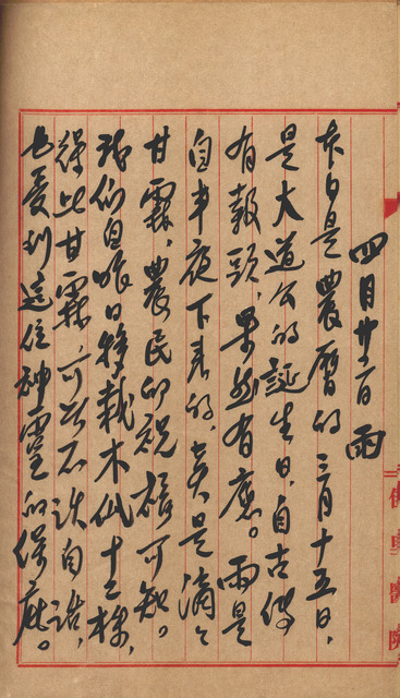 此為吳新榮寫於1959年4月22日日記,吳新榮將20、22日日記合併於22日撰寫;20日,吳新榮新後前往新營的台南縣文獻委員會辦事,後赴衛生院以臺南縣醫師公會顧問的身分出席該公會理監事聯席會議,會議後前往臺南,偕同妻子林榮樑一同赴赤崁戲院看電影;4月22日為農曆3月15日,該日為大道公誕生日,吳新榮將天降甘霖與神明賜福相互連結,並與家人一同奉香、放炮慶祝、禱告。   醫師公會為聯合地方乃至於全國醫師之團體,目的為協調同業關係、促進醫療既技能、維護共同權益、辦理醫療保險、推行社會服務為宗旨,在編制上有理事長、常務理事、理事、監事、顧問等等,因理監事會移交移交一事,吳新榮以臺南縣醫師公會顧問的身分出席理監事會議,另外,吳新榮次子吳南河也曾擔任該醫師公會理事長。   又,奉香祈神禱告,日本殖民末幾年的中日戰爭造成民生蕭條加以當時次子南河久病一事,讓自詡崇尚科學且提倡不迷信神佛的吳新榮出現一度動搖的現象,或許當時對生活各方面的無能為力,將心靈寄託於神靈、卜卦等等,才得以稍得解放,至今以戰後十餘年,生活亦大致底定,從吳新榮日記中的描述,可以得知該次的奉香祈神除了因妻子信神外,對於天降甘霖一事,也認為是大道公誕生日所降下的福報。
