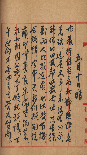 此為吳新榮寫於1959年5月10日日記,昨日(5月9日)徐清吉、鄭國津來訪,吳新榮提到舊友四散各地,因徐、鄭兩人居住較為鄰近,也較有機會見面談情;今日(5月10日)為5月的第2個星期日,亦即母親節,同時也是英良的誕辰,且孩子剛好都在家中,吳新榮便交代廚房準備虱目魚麵線做為慶祝。   日記中提到徐清吉、鄭國津等人,日本殖民時期,吳新榮時常與三五好友相約打麻將、上酒館、看電影等,與友人一同將社會的失意發洩在此等休閒活動外,對地方民意代表選舉、公共事務也經常與之來往;隨著戰爭結束、國民政府到來,經歷了一段不安穩的日子後,家中孩子漸長、事務也漸繁忙,加上年紀大不宜同年輕時年少輕狂的活動,都讓吳新榮與友人互動漸少,隨著日記中與友人共同出遊、嬉戲的紀錄比重漸次減少便可以證明此種心情。   又,吳新榮提到對國家不能如意、對社會非無失望,可謂一語道破當時不少士人的心聲,戰後臺灣回歸,臺籍人士無不歡欣鼓舞,無不盼望終於能堂堂正正在屬於自己的國族內貢獻社會抱負時,沒想到國民政府的高壓統治,對這些人士的打壓甚至更甚於日本殖民時期,且歷經228事件、白色恐怖,加上吳新榮屢次參選失意的挫折,終使其將生活重心轉向編纂地方文史工作以及與家人的生活。