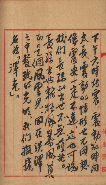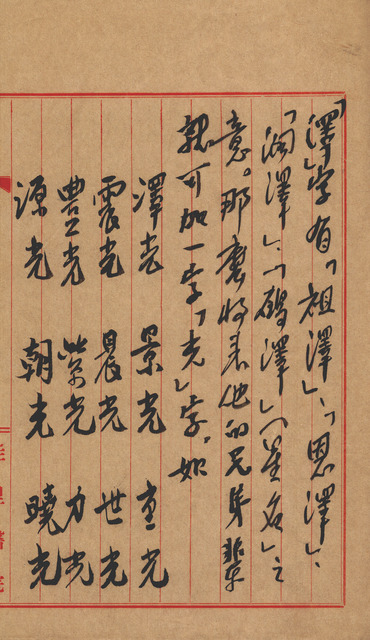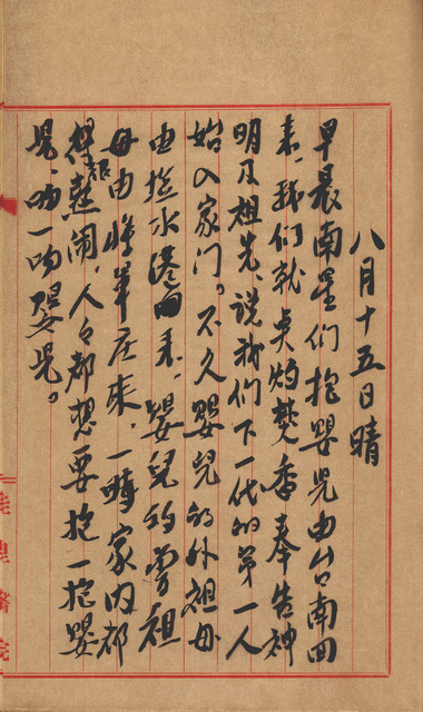 此為吳新榮寫於1959年8月15日日記,吳新榮於日記中記錄了長孫出生的喜悅及家人紛紛前來慶祝一事;吳新榮將孫子的命名與其出生前後的事物相聯結,並以此擬名為「澤光」。   根據吳新榮撰寫於8月9日日記中,當日是父親節,同時也是長孫出生的日子,然而在孫子出生的過程中,卻是一波三折,8月7日,因長媳不慣住院,便與其母親離院返家,但至晚上時突然腹痛,便叫車準備前往醫院,然而因為颱風的關係,鹽水溪橋崩,只得不斷繞路,最終因災害嚴重而無法前進,所幸路途中遇到公路局的大公車協助,於是吳新榮等一行人便藉由公車司機的好心相助順利前往醫院,8月8日當天,長孫順利出生,不過外頭仍風雨交加,於是吳新榮認為這日出生的兒子為「風雲兒」取名澤光意即在洪澤之中發現光明,另外,15日日記內也提到「澤」還有「祖澤」、「恩澤」、「潤澤」、「鶴澤」之意。