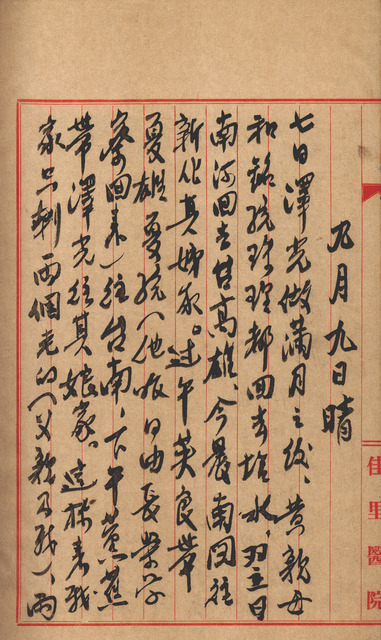 此為吳新榮寫於1959年9月9日日記,吳新榮將9月5日、9月7日日記合併撰寫於9日;9月5日,陳天賜邀吳新榮訪土地銀行周景祥經理;後吳新榮訪周顯文,並一同赴永樂公共食堂晚餐,因5日拜訪周景祥撲空,故9月8日吳新榮再次來訪,後與周景祥、鄭國津一同晚餐;9月7日,長孫澤光滿月慶祝畢,家人、親戚各自返回,家中僅剩下自己與父親吳萱草、兩子(吳南星、吳夏平)及兩個傭人。   日記中,吳新榮將9月7日澤光彌月的後續稍作交代,慶祝完畢後,家中成員、親朋好友各自返回工作崗位,頗有種人去樓空之情境;彌月即為嬰兒出生滿月的慶祝傳統,當嬰兒出生滿一個月,家中會進行燒香、祈神、宴客等活動,此外會為嬰兒剃胎髮,有著象徵從頭開始之意。   又,今日慶祝彌月可見到送油飯、蛋糕等禮物,這個慣例可以追溯至早期社會,當時男女成婚須靠媒人的撮合,在家境普遍不殷實的農村社會,通常會給予媒人婆活雞一隻,用以祭拜送子觀音(但祭拜後須返還農家,之後用來替孕婦補身體),油飯則給媒人吃,直到社會經濟整體提升時,才逐漸演變為送油飯的慣例,不過早期社會重男輕女,故生女並無如此隆重的慶祝儀式,一直要到近代逐漸男女平等,商家操作下,彌月禮送油飯(男)、蛋糕(女)也成了現代的定例。