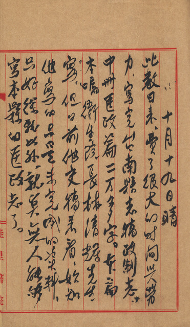 此為吳新榮寫於1959年10月19日日記,數日來,吳新榮因《臺南縣志稿》編纂與催稿耗費不少心力;吳新榮本囑林清輝先生撰寫縣志稿中的〈醫政篇〉,但因其未完成,故只得由自己來撰寫;睡前,吳新榮隨筆寫〈猪的故事〉一文準備交稿,另外也提到今年自己尚須完成的兩篇文章已有八成的完成度。   從先前日記來看,9月30日,吳新榮赴文獻會中與副主任委員洪波浪討論如何進行編纂工作,當時得到結論為:「可以犧牲季刊不印,也要在本年預算中,完成《縣志稿》全部。」數日間,吳新榮耗費很大時間與勞力,除了須去聘人撰寫縣志各篇專題外,自己還需負責催稿、徵集、整理等工作,另外還肩負撰寫其中的〈聚落篇〉,可謂心力交瘁。   又,本囑林清輝先生撰寫的醫政篇,後由吳新榮親自撰寫,當時,吳新榮提到:「只好除我以外,就算無人能夠寫本縣的醫政志了」;因為吳新榮自日本殖民統治時期即於佳里診所執業,其中擔任駐校醫師、公醫,且對於地方上的醫生醫事十分關心,甚至1939年還曾找到,並前去反映《日本醫事》年鑑中所記載的錯誤,故吳新榮可以算是撰寫該專題的不二人選。