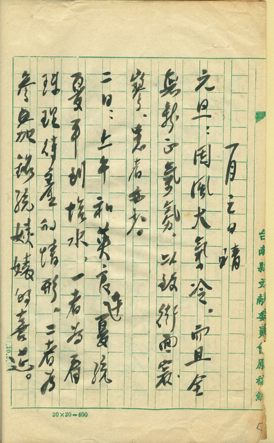 此係吳新榮寫於1960年1月3日之日記。本日日記記錄1月1日至1月2日之日記。1日因天氣寒冷,街景寂寥,患者亦少。2日上午吳新榮與林榮樑、吳夏統、吳夏平前往鹽水,途中見鹽水、學甲、佳里、臺南四地間已開始有柏油路及橋樑,認為將使吳朱里和黃雲嬌來往更方便;抵達鹽水後,吳新榮先拜訪向親家黃雲嬌家致敬,並見長孫吳澤光,後拜訪吳朱里家,參加其姨表翁銘統的喜筵,並關心吳朱里的生產情形,得知生產時間未定,故於喜筵後回佳里。回家後得知林永睦上午前來探望其岳父吳萱草。吳新榮今年收到的賀年卡有所增加,吳新榮不打算回禮,僅在日記上記錄其分類及數量。   吳新榮在從前有寄送賀年卡的習慣,若有人寄來賀年卡,吳新榮亦會寫下其處數量及寄出地點。後來因戰爭及時局等環境因素,直到1956年方再次有收到賀年卡的記載,而由1956年1月1日日記可知,吳新榮雖有將其收納並詳加記錄,然因當時的吳新榮認為此為繁文縟節,同時亦想省下寄送的費用,是以特別將寄送人記於日記上以代替此禮。但在1961年1月1日日記中,吳新榮為告知友人新地址與為自家醫院做廣告,回寄了一千張的回禮;而在1964年1月15日日記中,為告知新地址,也寫了600張賀年卡。吳新榮對賀年卡的看法,從戰前的積極到逐漸失去熱情,戰後視之為繁文縟節到為宣傳及通知而寄,其中變化受戰爭、社會環境、個人經濟狀況等因素左右,是為其人生歷程變化的一面向。