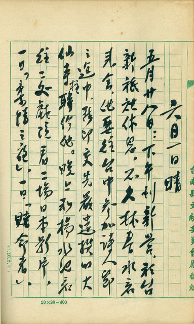 此係吳新榮寫於1960年6月1日之日記。本日日記記錄5月28日至6月1日之日記。5月28日吳新榮下午於新營臺新旅社將吳萱草遺撰的大仙寺柱聯交給林春水。晚上和楊水池在兩間戲院分別觀影〈柔情之夜〉,與〈睹命者〉。29日北上拜訪吳三連未果,後拜訪黃寄珍、郭耀南、吳敏誠,打探勞工保險指定醫的消息。下午於臺灣大學附屬醫院會議室參加臺灣省醫師公會理監事會,除黃文陶與蘇振輝感情用事的舌鬥外,皆為例行。會後到怡美行與黃寄珍、沈春暉投宿新北投沂水園。30日到怡美行與吳南圖及柯先生會合,由柯先生嚮導,拜訪勞工保險局負責人李文鐘。據其說法成為勞工保險局指定醫院雖不易,但吳新榮自認已知概況。後三人拜託吳三連與吳尊賢幫忙後到附近的湘菜館午餐。餐後吳新榮與吳南圖請臺灣省文獻委員會李騰嶽閱覽吳萱草遺稿,後與台北市文獻委員會王詩琅談論文獻。回到怡美行與郭睿報告今日經過並在此晚餐後與黃寄珍、吳南圖到第一劇場觀影〈南國土佐〉後南下。31日因感冒而臥病在床。6月1日恢復並整理事務,寫信,預定在《臺南縣志稿》索引編完後至大凍山採訪。   吳新榮由於身兼數職,事務繁忙,或是受外在環境左右,時有無法當其書寫日記之情形,是以吳新榮會選擇某一日日記,記載先前一日或數日的簡略事務,包含本日經歷一同記於同一篇日記中。如本篇日記因吳新榮北上而無法書寫日記,是以直到6月1日方將先前經歷一次紀錄。   新生醫院,原名新生聯合醫院。1960年6月18日,吳新榮與三名佳里醫生與四名臺南醫生承租原榮凱醫院舊址,共同計畫、籌備興建新生聯合醫院。分設內科、外科、婦產科等專科,為佳里第一家綜合醫院。吳新榮任院長兼內科主任。後於1963年,購買樂春園土地興建院設,沿用新生聯合醫院之名,獨立經營;1965年成功與勞工保險局簽訂合約,成功承辦勞工保險醫院,1967 年改名為「新生醫院」迄今。由本年度5月9日日記可知,吳新榮已開始關注並嘗試了解勞工保險相關事宜,且已有與其他醫生共同合作開設綜合醫院的計畫。此次北上便向勞工保險局負責人李文鐘詢問勞工保險局指定醫院的受理條件。   《忘憂洞天詩稿》為吳新榮父親吳萱草所著,吳新榮編輯成冊。吳萱草幼時學習漢學,以詩文見長,曾於1912年與諸多詩友組建嶼江吟社,後經多次改組,遷移,改名,整合,成為全縣性的南瀛詩社,對吳新榮的文藝之路有十分重大的影響。吳萱草著詩甚多,吳新榮曾為慶祝父親的七秩大壽,輯其所作詩二千多首,為《忘憂洞天詩集》。於本年度5月27日日記可知,在父親去世之後,重拾《忘憂洞天詩集》續卷的整理工作,並於計畫拜託李騰嶽寫序文。 李騰嶽,號鷺村,筆名夢癡、夢星,臺北蘆洲人。京都帝國大學醫學博士。曾於臺北開設宏仁小兒科醫院。好詩文,精研臺灣民俗。戰後任「通志館」顧問委員會簡任委員、臺灣省文獻委員會編纂主任委員。著有《臺灣醫事衛生發達簡史》、《李騰嶽鷺村翁詩存》等,是台灣著名的醫師、歷史學者與詩人。