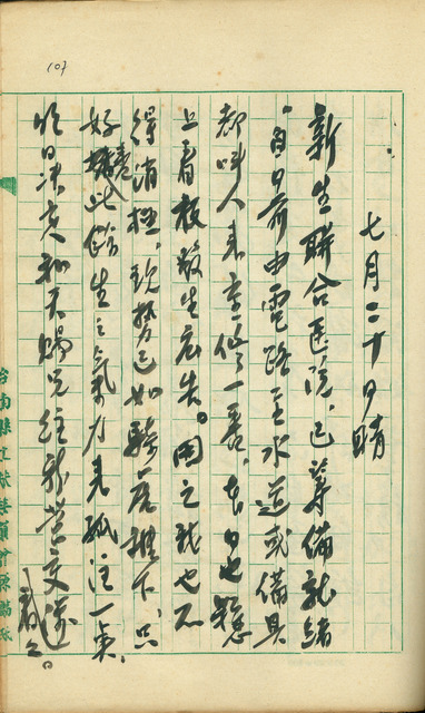 此係吳新榮寫於1960年7月20日之日記。新生聯合醫院已籌備就緒,本日也在看板廣告。吳新榮決定孤注一擲。明日和陳天賜前往新營交涉。   新生醫院,原名新生聯合醫院。1960年6月18日,吳新榮與三名佳里醫生與四名臺南醫生承租原榮凱醫院舊址,共同計畫、籌備興建新生聯合醫院。分設內科、外科、婦產科等專科,為佳里第一家綜合醫院。吳新榮任院長兼內科主任。後於1963年,購買樂春園土地興建院設,沿用新生聯合醫院之名,獨立經營;1965年成功與勞工保險局簽訂合約,成功承辦勞工保險醫院,1967 年改名為「新生醫院」迄今。由本年度5月9日日記可知,吳新榮已開始關注並嘗試了解勞工保險相關事宜,且已有與其他醫生共同合作開設綜合醫院的計畫。其後的日記中也多次提及吳新榮於人協商,向他人洽詢開設醫院與取得勞工保險資格的情況等事前相關準備,是為吳新榮在戰後積極籌備的事業。吳新榮在戰後任台南縣文獻委員會編纂組長,是以在組織新生聯合醫院時,被視為公務員而屢屢受到阻難,在萬事俱備,騎虎難下的局勢下,吳新榮也只能再前往新營交涉。   陳天賜,臺南將軍人。日治時期曾任青山港漁業組合會長。1951年向政府爭取建設避風港,由政府出錢人民出力,建造了臺灣第一座避風港「青山港」。戰後曾任臺南縣議員、北門區漁會理事長、將軍區漁會理事長。是吳新榮公學校的同學,本日作為至友與吳新榮到新營交涉醫院成立事宜。