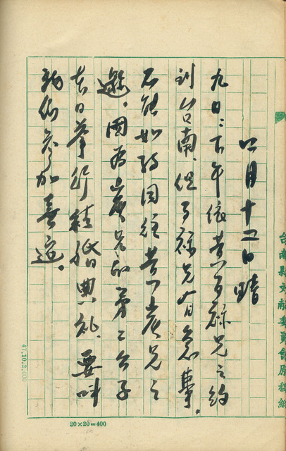 此為吳新榮寫於1961年4月12日日記,吳新榮將4月9日至12日合併記載於12日日記中,9日,黃炭邀吳新榮等人出席其次子結婚喜宴;喜宴結束後偶遇陳日三,便一同赴南都戲院看「金字塔喋血記」電影;後與友人一同赴大林鳳仙閣一遊;10日,晚上與數人至新樂園酒家小點後,回到病院中以打麻將之勝負決定菜費;11日,臺南紅十字會施文雄來電告知政委蔡培火欲於新營召見吳新榮等人,但吳新榮認為自己與政治脫節已久,對於蔡培火召見一事頗感納悶;晚上,吳新榮應蔡茂新邀請,一同赴寶美樓晚餐;12日中午,鄭國湞、陳朝琴來訪,後再邀徐清吉一同前往樂春樓午餐。   吳新榮提到蔡培火召見其一事,蔡培火於戰後先後擔任立法委員、國民黨政務委員、臺灣省紅十字會會長等職,而該次召見吳新榮等人是為改革政治一事前來到地方上徵詢意見,事前吳新榮對蔡培火指名召見自己感到納悶,因為自戰後經歷政治日益敗壞且選舉頻頻失利,繼之自己身體狀況不佳等等,至今已將精力重心放在文獻會、家庭、醫事上;而在日記中對於實事、政治的撰寫亦明顯減少許多,故此次會見過程中,吳新榮也於13日日記中提到自己不表示意見。 又,合會的由來為清朝民間之互助會,共有搖會、寫會(標會)、搖干三種,起會之會首因種種原因有資金需求,便會廣徵親友籌資湊會,此由福建移民帶入臺灣,且盛行之,在民間金融中扮演重要角色。