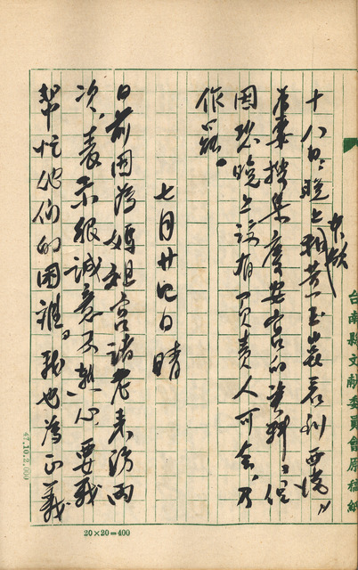此為吳新榮寫於1961年7月18日日記,晚上,吳新榮本想與黃玉崑一同蒐集慶安宮資料,但因無事先約好,且擔心晚上無人可詢,便作罷。   日記中提到的西港慶安宮設立於康熙51年(1712)年,至今300餘年中該廟一共經過6次重修重建,才為我們現今所見之面貌;西港慶安宮主祀天上聖母,且以每3年為週期於農曆4月底舉辦刈香活動,場面盛大壯觀,在吳新榮5月29日日記中亦提及提到相關記載。   又,西港慶安宮作醮、刈香遶境之活動,舉行時間為農曆4月的中下旬,照往例,每屆香期時,需至鹿港天后宮祖廟迎請「鹿耳門媽」前往西港建醮;此外,「西港香」與佳里金唐殿之「蕭壟香」、學甲慈濟宮之「學甲香」、土城仔聖母廟之「土城仔香」也合稱臺南地區五大香。
