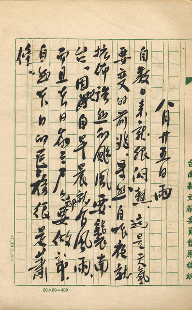 此為吳新榮寫於1961年8月25日日記,日記中提到,數日來的天氣悶熱象徵著颱風前夕暴風雨的寧靜;因颱風鋒面逐漸接觸,該日醫院的醫務頗為蕭條;因颱風來襲,使吳新榮利用這兩日修改〈臺灣遊記〉中臺南縣的相關內容。   鄧文儀,字雪冰,學生時期先後入廣州大本營陸軍講武學校、黃埔軍校就讀,並加入中國國民黨;1924年討伐叛變軍閥陳炯明時負傷,1925年赴俄羅斯莫斯科大學就讀,1931復興社成立,成為復興社13太保之一,1935年派赴蘇聯擔任中華民國駐蘇聯大使館首席武官;中日戰爭前,發生張學良、楊虎城以挾持蔣介石換取對日抗戰之西安事變,鄧文儀時以三民主義力行社書記參與處理;後中國陸續發生中日戰爭、國共內戰等戰事,隨著1949年國民政府於大陸戰場敗退,鄧文儀亦於此時隨軍來臺;來臺後鄧文儀撰寫諸多書籍、文章,其中有《臺灣農村訪問記》、《臺灣遊記》、《耕者有其田紀實》與臺灣相關之文獻,而日記中,吳新榮收到文獻會寄來鄧文儀《臺灣遊記》一稿,並對其進行校正。