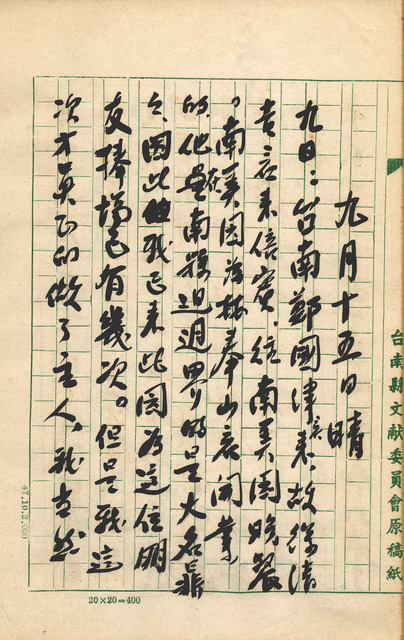 此為吳新榮寫於1961年9月15日補記9月9日日記,吳新榮邀請鄭國津、徐清吉等老友至林奉山所開設的南美園吃晚餐;吳新榮提到先前至南美園都以陪賓身分出席,但此次做為地主之主人身分出席,故又邀請數人一同來與宴。   日記中,吳新榮以東道主身分邀請數位友人一同共襄盛舉,自下午4時飲至晚間11時,好不熱鬧,若我們回顧吳新榮之日記,可以發現日本殖民時期的吳新榮對於宴飲、聚會一事可說是家常便飯,因對於社會現狀之無力,當時吳新榮將生活寄託於打麻將、飲酒、聚會、工作上,當其開始參與公共事務時,亦有不少次與臺、日人士飲酒應酬,不過隨著時局變化、年紀漸長、事務繁忙之故,此種相關紀錄於日記的重也漸漸下降,一來,1945年到1949年間,受轟炸的臺灣百廢待興,而國府到來為應付對共之戰爭實施統治經濟,繼之物價飛漲、經濟蕭條、治安敗壞,導致普遍民生狀況不佳,二來,吳新榮於228事件受牽連入獄,數月餘診所未開也導致原先患者另尋他處,收入不穩,此外,1950年因對局勢之精神操心,導致吳新榮患高血壓,身體狀況不佳,且見聞叔父吳丙丁因高血壓逝世,對此戒慎恐懼,除偶有少數應酬、友人來訪特殊場合外,生活作息較日本殖民時期更為規律。   又,徐清吉、鄭國津為日本殖民時期時常與吳新榮飲酒、麻將之好友。