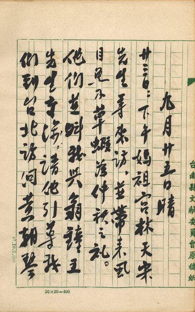 此為吳新榮寫於1961年9月25日補記9月23日日記,下午媽祖宮林天宋來訪吳新榮,除了贈送虱目魚、草蝦等禮品外,亦針對鹿耳門爭議一事請託吳新榮透過翁鐘五等人向黃朝琴議長陳情;晚上,赴南美園出席《鄭靜夫詩集》出版祝賀會。   自該年5月以來為因應鄭成功開臺300週年紀念活動,吳新榮頻頻提到鹿耳門媽祖廟正統之爭一事;1956年,救國團委任臺大歷史系教授楊雲萍赴臺南調查鄭成功登陸遺址,並在村民引導下來到今日顯宮(媽祖宮庄)處,該處村長出示一尊媽祖神像,說明該神像為當年鄭成功座船上之媽祖,且帶領楊雲萍等人至鹿耳門溪邊,指出當年鄭成功登陸之地,研究團隊隨後刊登該次研究之報告後,引發了鹿耳門舊跡(媽祖宮庄)與土城子(土城庄)之爭,此後大小爭論意見不斷;1961年因逢鄭成功開臺300週年,各項祭典、文物展覽、研究如火如荼展開,紛爭便又隨之擴大,故7月26至29日日記中,吳新榮陪同林天宋等人赴臺北之臺灣省文獻會中與相關人士討論,並歷訪學者,希望可以藉由權威學者撰文弭平紛爭,不過到了9月23日林天宋來訪,並告知打算將鹿耳門爭議陳情至議長黃朝琴處,讓其主持公道一事,著實讓吳新榮頗感訝異,對於此爭論擴大至此可說是始料未及。