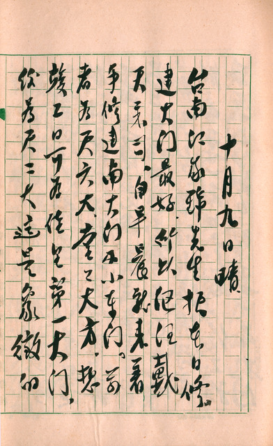 此係吳新榮寫於1962年10月9日之日記。江家錦前來協助吳新榮修建琑琅山房的大門。另提及日前陳昌言談起振興佳里詩社之事,並邀請吳新榮出面主持。   關於日記中提到的琑琅山房,是吳新榮在1942年前妻毛雪病逝後將小雅園內的木造病房改建而成,作為孩子們的讀書室和紀念毛雪的紀念堂使用。而「琑琅」之名則是取自「蕭壟」的諧音,因吳新榮所在之佳里昔日為西拉雅族蕭壟社的所在地,吳新榮便以此為諧音取「琑琅」之名,並自稱「琑琅山人」。至於修建琑琅山房之事,於1962年8月1日的日記中曾提及此事,因為女兒吳亞姬預定在1963年中結婚,因此決定在此之前先修建琑琅山房的圍牆、大門以及通路,本篇日記提到因為日子好,所以江家錦選擇這日前來進行大門的修建工程。