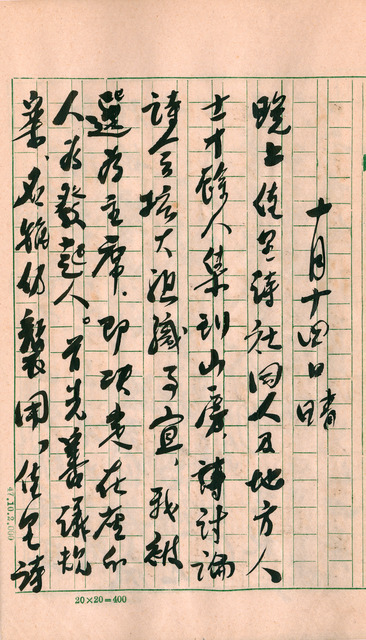 此係吳新榮寫於1962年10月14日之日記。吳新榮與佳里詩社同仁齊聚在琑琅山房中討論擴大詩會組織的事宜,吳新榮被選為主席,最後決定延用「佳里詩社」之名,並訂定規則十條。   關於日記中提到的「佳里詩社」為現今之「鯤瀛詩社」,自1981年起於每年秋季擇一週日於臺南的南鯤身代天府舉辦「全國詩人聯吟大會」。鯤瀛詩社曾幾經改組,最初是1912年由王炳南、王大俊及吳新榮之父吳萱草所籌組之嶼江吟社,在中日戰爭爆發後因成員紛紛走避,活動漸趨停擺,戰後自海外歸來的「白鷗吟社」成員陳哮及陳昌言重整詩社,並改名為「琅環詩社」;1960年時又因成員多居住在佳里而改名為佳里詩社。本篇日記提到便是該詩社成員找吳新榮等人討論擴大詩會組織之事,雖然當日的結論是沿用佳里詩社之名,但之後於1962年11月29日(補記12日)的日記中提到詩社在金唐殿舉行佳里詩人大會,會中決定擴大組織規模改成全縣性的詩社,並將社名改為「鯤瀛詩社」。