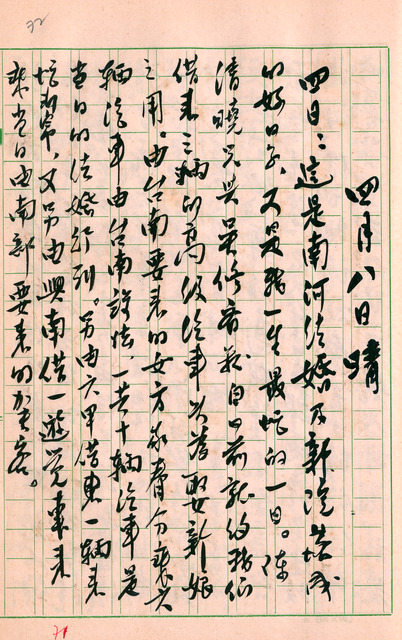 此係吳新榮寫於1964年4月8日補述4月4日日記,當日為次子南河結婚之日,由宗叔吳三連證婚,婚禮會場在新落成的新生醫院。   日記中提到的新生醫院,係1963年,吳新榮購買住家旁的樂春樓土地,興建「新生聯合醫院」,除作為新院,也有意讓兒子南河回鄉行醫,同時,新院落成於1964年4月4日,也是有意與南河婚禮同一天。吳新榮次子南河與台南郭家女兒昭美結親,近來吳、郭兩家密集商討婚禮事宜,兩家於1964年4月4日完成人生大事,婚禮由宗叔吳三連證婚,還有北門中學樂隊演奏,婚禮會場就辦在新落成的新生醫院內,熱鬧盛大。