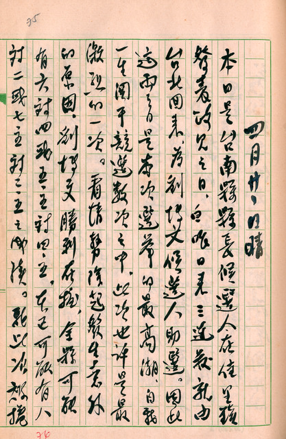 此係吳新榮寫於1964年4月21日日記,吳三連自北返南為劉博文助選;次子南河夫婦新婚旅行回來;吳新榮夫妻對相處方式有所討論。   日記中提及縣長選舉一事,係指1964年全台縣市長選舉,台南縣教育局科長劉博文參與台南縣長選舉一事,據吳新榮日記所載,因宗叔吳三連的請託,加上為了「鄉土的精神團結」(1964年2月10日吳新榮日記),在此次第5屆台南縣長選舉中,吳新榮為劉博文助選,並以琑琅山房為聚點,組織助選團。在這段期間,吳三連也數次返鄉助選,吳新榮並陪同在側。